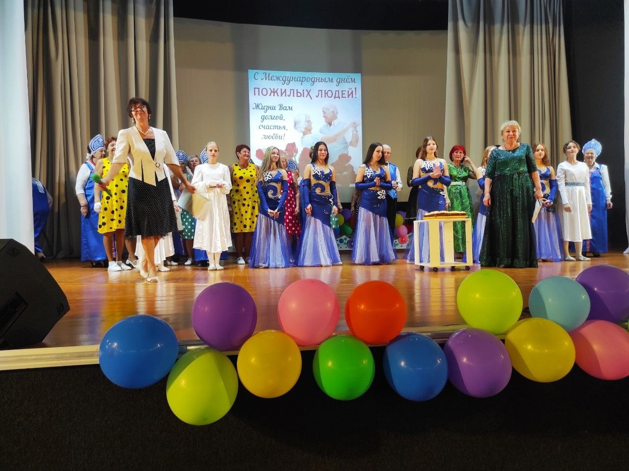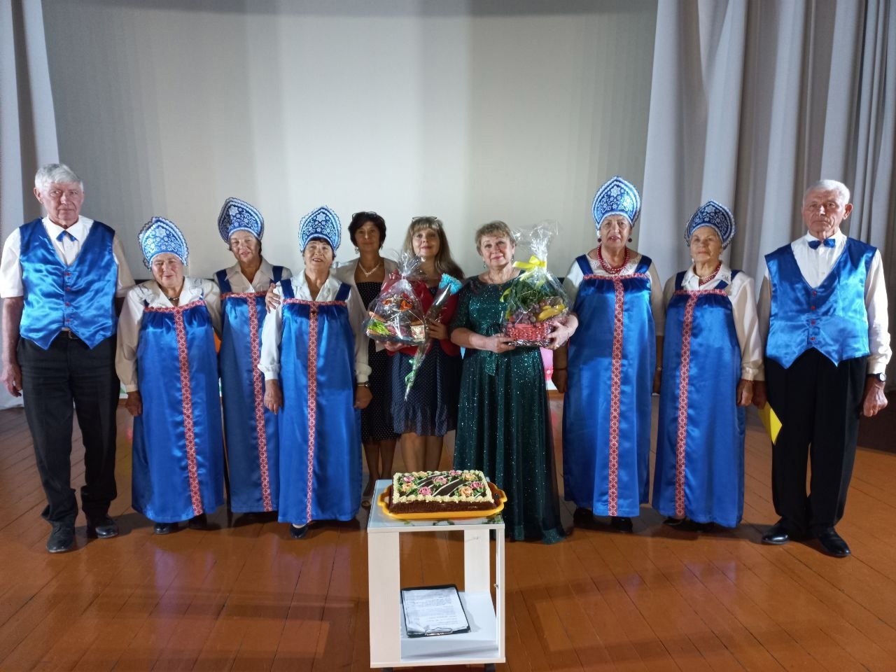 Гостинцы и сладкие подарки преподнесли: Наталья Перевалова, Лариса Белецкая, предприниматель Екатерина Галкина. Большой праздничный торт «серебряным» артистам преподнесла куратор проекта «Старшее поколение» Анна Пупкова.